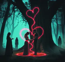 Fios de luz escarlate surgiram do chão como serpentes encanta das entrelaçando seus corpos em um ritmo lento, quase solene. A energia os envolvia em espirais quentes, conectando seus corações como cordas vivas de um destino inevitável. Dois laços se formaram no ar: um em volta de seus pulsos unidos, o outro acima de suas cabeças, curvando-se em forma de coração flamejante. Uma aura dourada começou a brotar do solo, envolvendo o casal em calor e luz, como se os próprios deuses tivessem parado para assistir ao espetáculo sagrado da união impossível. Amara parecia mais humana, o brilho vermelho de seus olhos suavizado pela proximidade de Lucien.